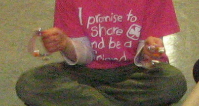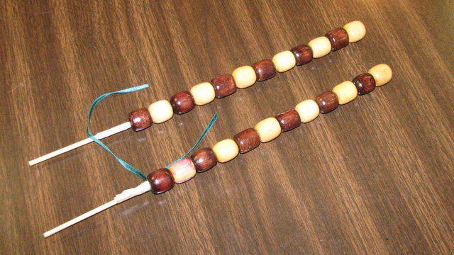 Before the meeting, glue one bead onto the end of each skewer. This will ensure that the remaining beads will stay on the stick. Thread remaining beads onto the sticks and use masking tape at the end to keep them on. Rub the sticks together to "play" them.