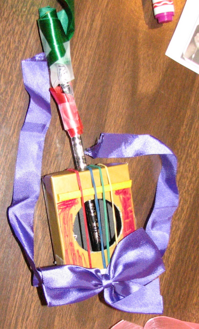 Stretch elastic bands over box. Place the short stick under one end of the elastic bands. Make a hole in one end of the box and stick the pencil through it to make a handle. Decorate the box.