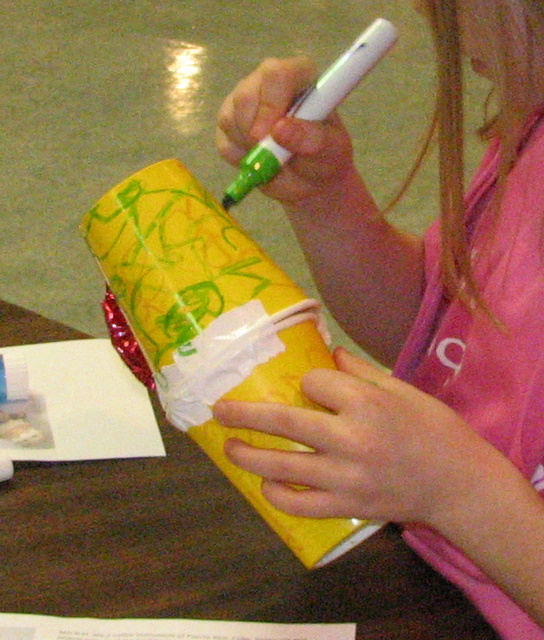 Stretch elastic bands over the hole in the tissue box. Tape paper towel tube to one end of the tissue box. Decorate with markers.