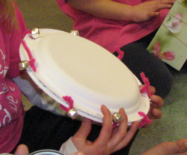 Staple the plates together, bottoms facing outwards. Hole punch around the rims. Attach bells using pipe cleaner or ribbons. Decorate.