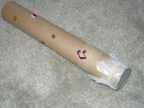 Poke holes in the tube using the scissors. Push the brass fasteners into the holes, and cover with tape so they won't fall out. Cover one end of the tube with wax paper, held on by an elastic band. Fill the tube with the dried beans. Cover the other end of the tube with wax paper held on by an elastic band.